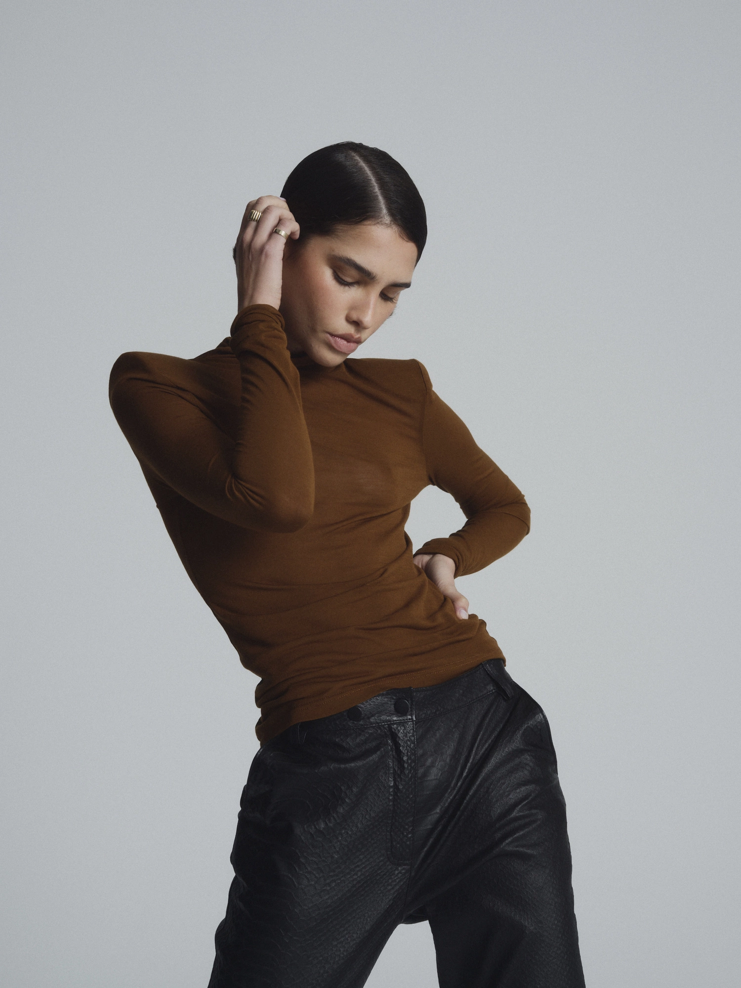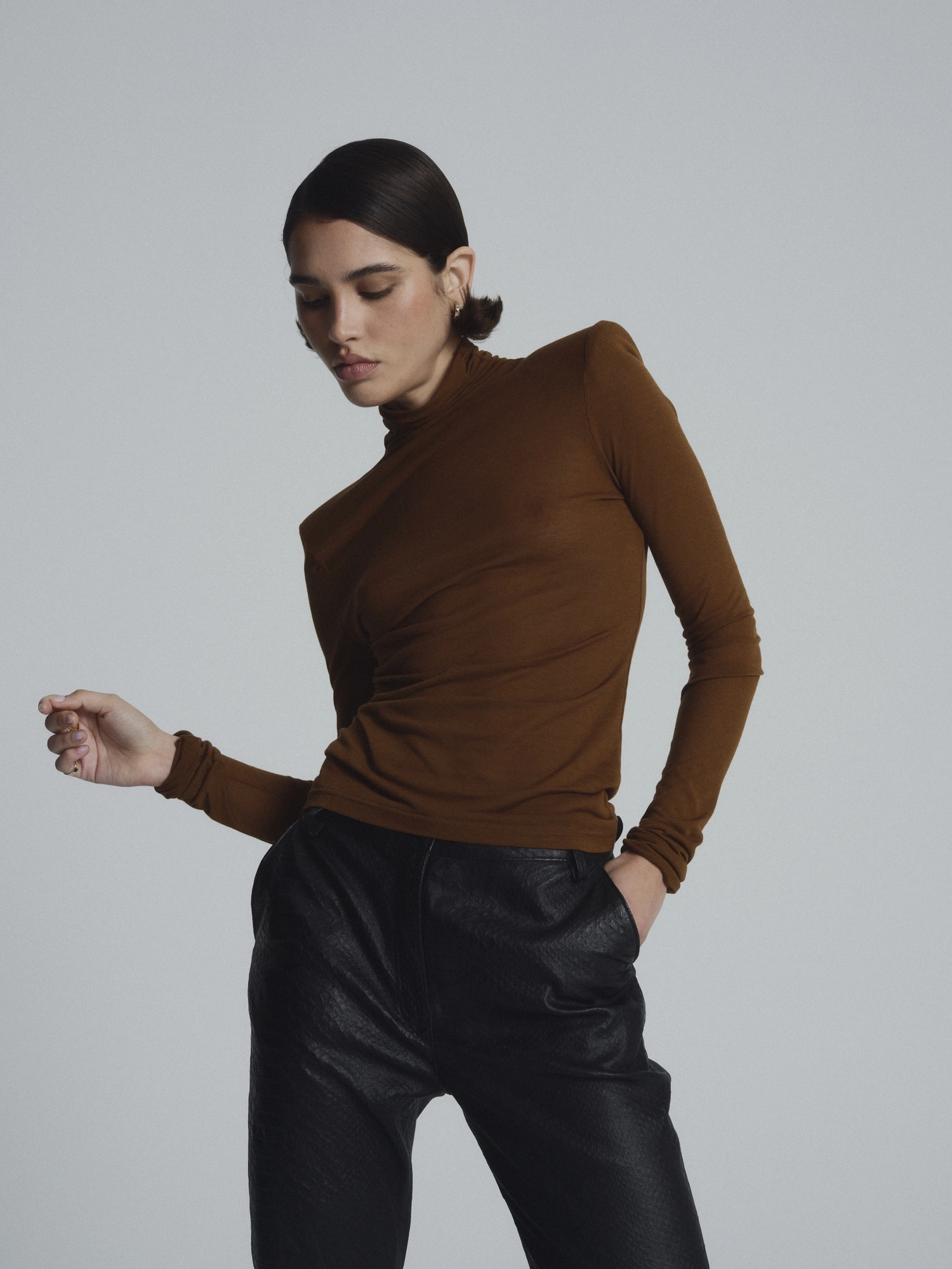 Dopasowany golf z długim rękawem, wykonany lekkiej z mieszanki wiskozy i jedwabiu. Minimalistyczny fason nadaje mu nowoczesnego charakteru, a delikatnie transparentna tkanina odważnego, ale jednocześnie subtelnego wyrazu. Idealny do noszenia solo z gładką bielizną lub jako baza do warstwowych stylizacji - pod oversize’ową marynarkę, skórzaną kurtkę czy casualową koszulę.