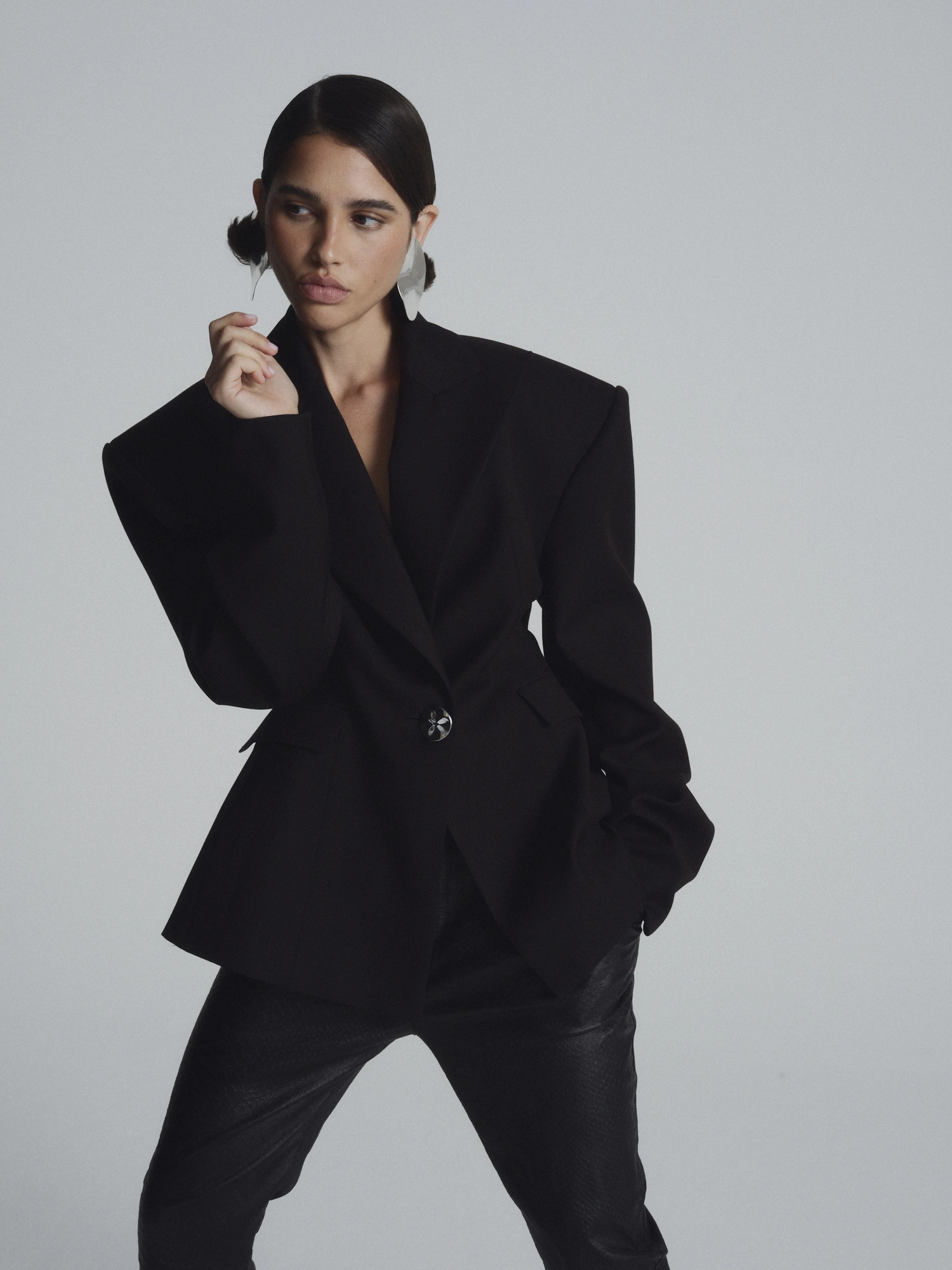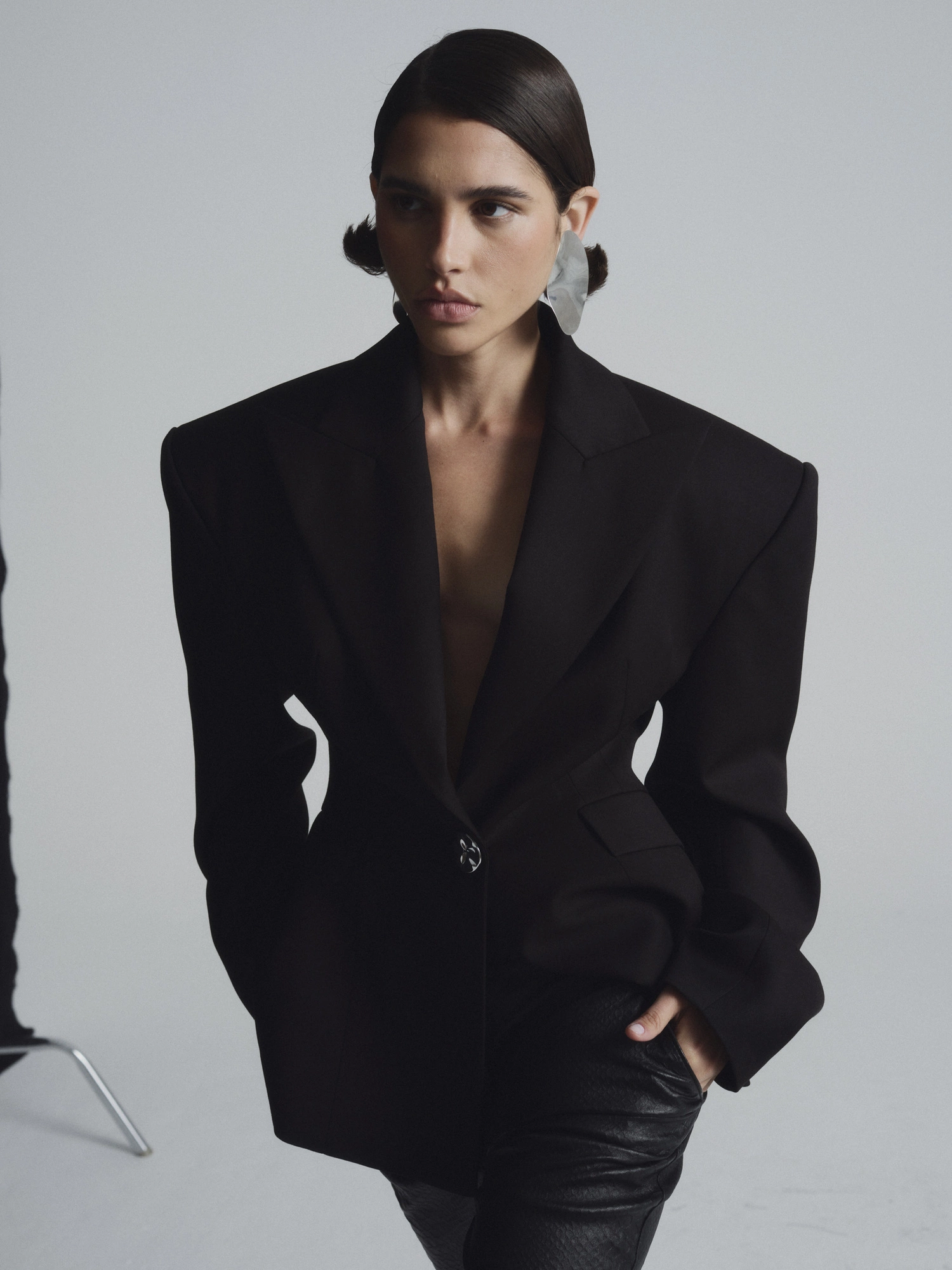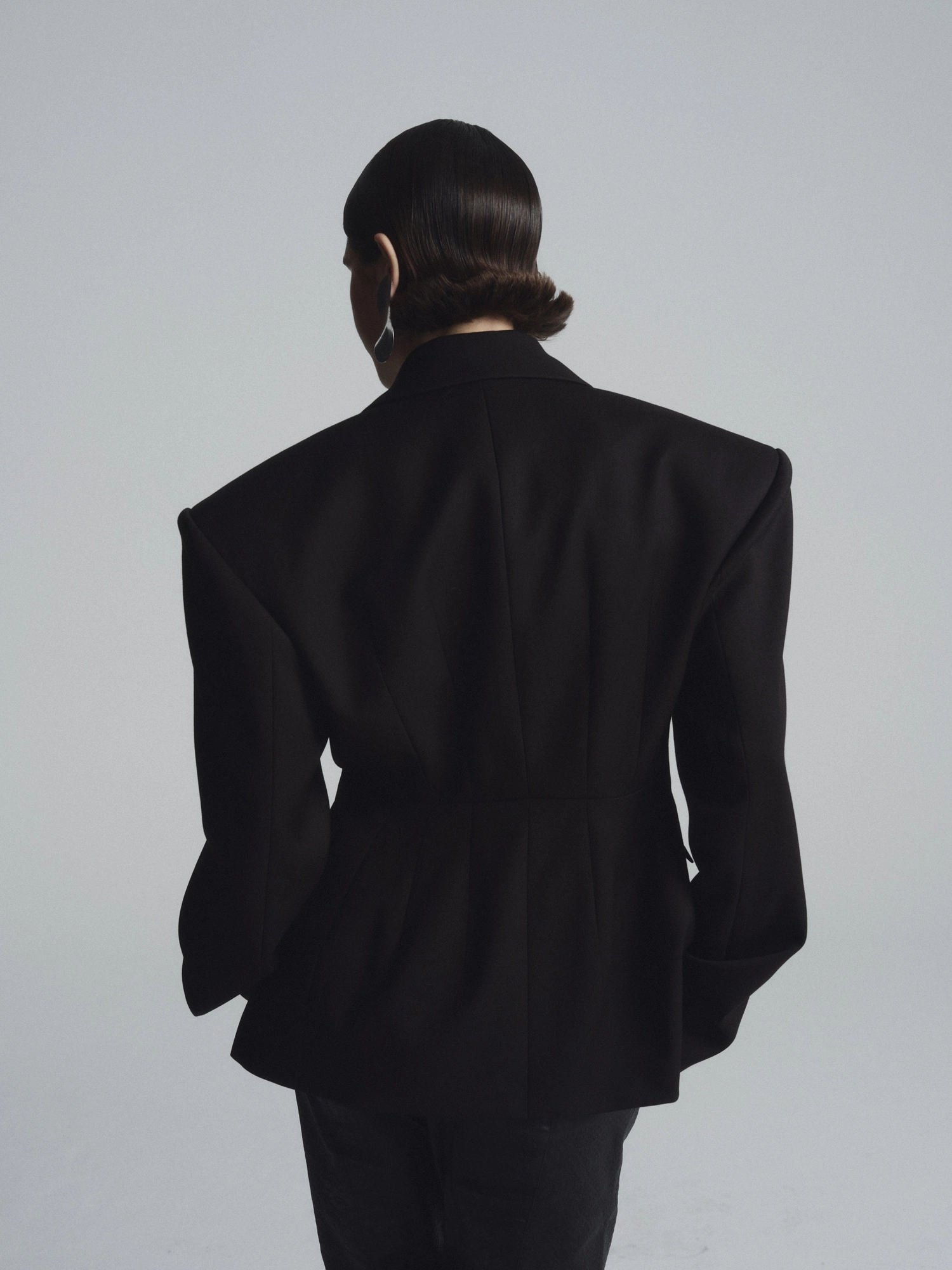 Smokingowa marynarka o wyrazistych, zdecydowanych proporcjach. Wcięcie w talii kontrastuje z mocną linią ramion, a minimalistyczne zapięcie na jeden guzik oraz klasyczne klapy tworzą harmonijną całość i wzmacniają jej elegancki, wieczorowy charakter. Wewnątrz wykończona podszewką z wiskozy.