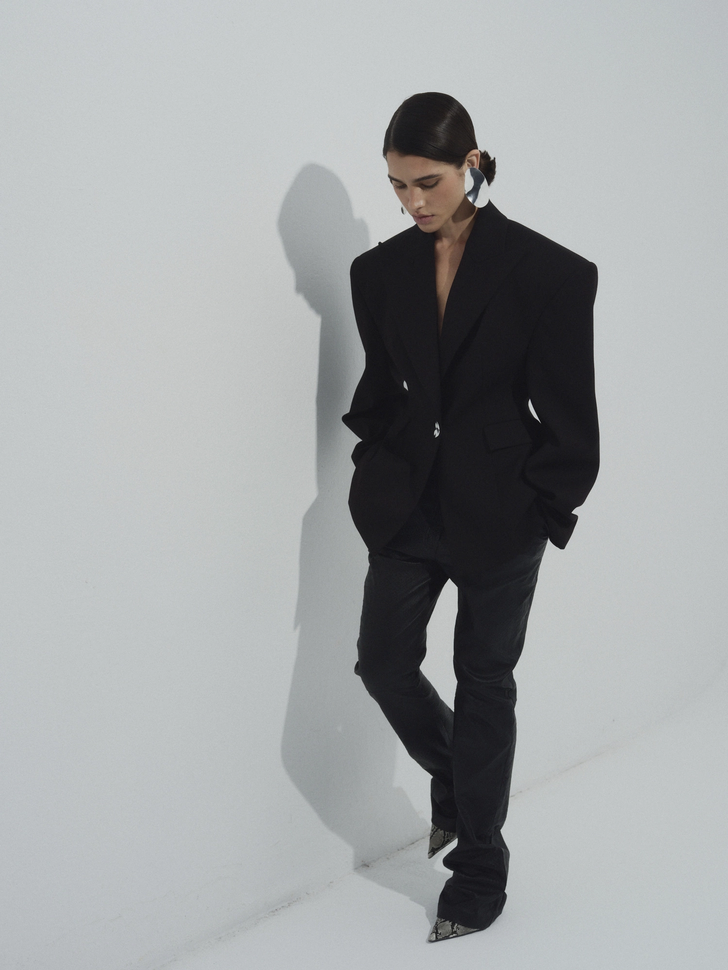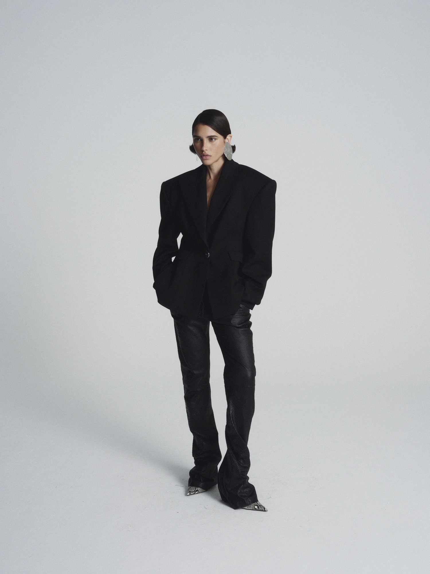 To marynarka, która sprawdzi się zarówno jako samodzielny element stylizacji, jak i w połączeniu ze skórzanymi spodniami, tworząc nowoczesną, kobiecą interpretację klasycznego smokingu.