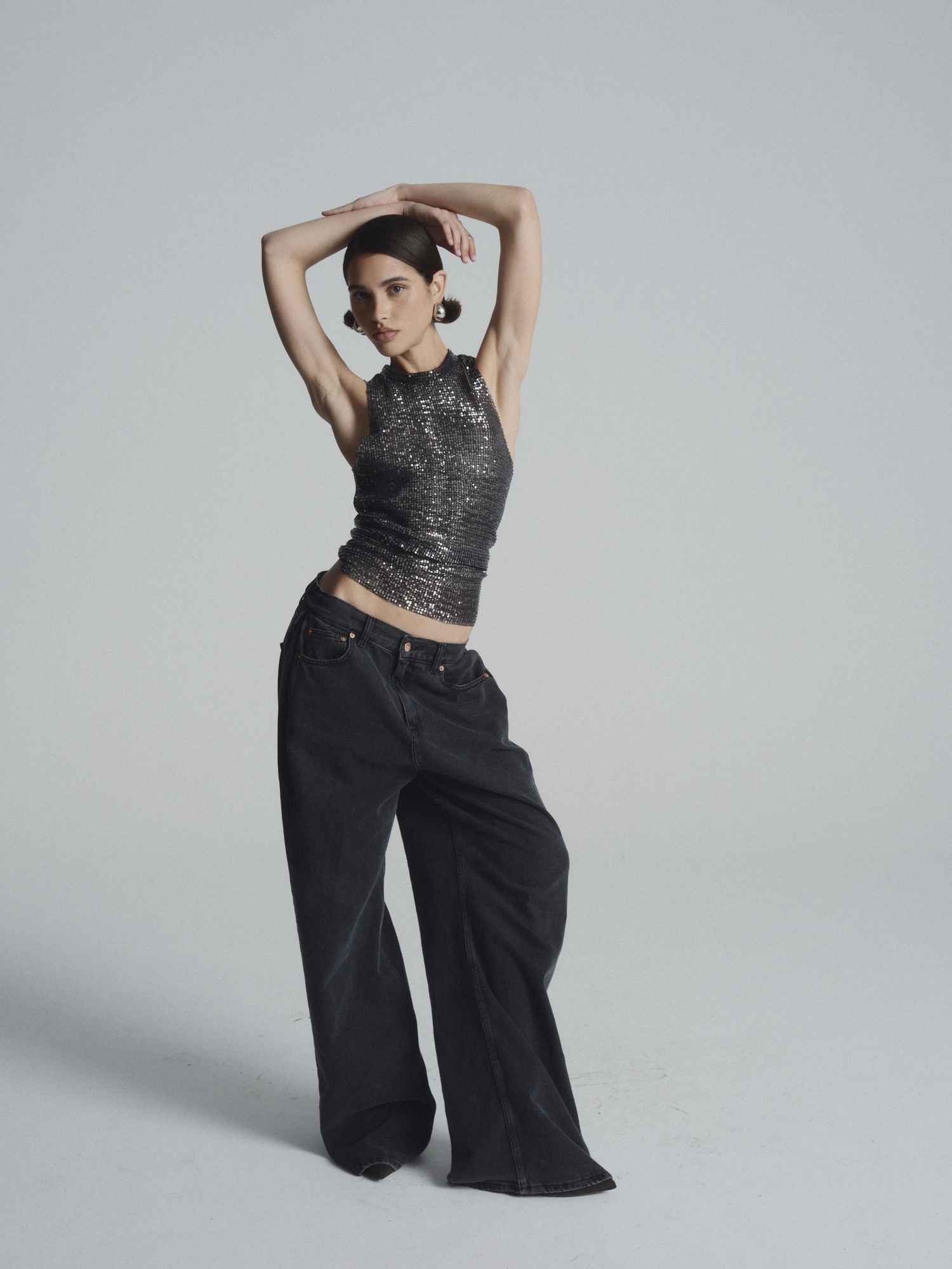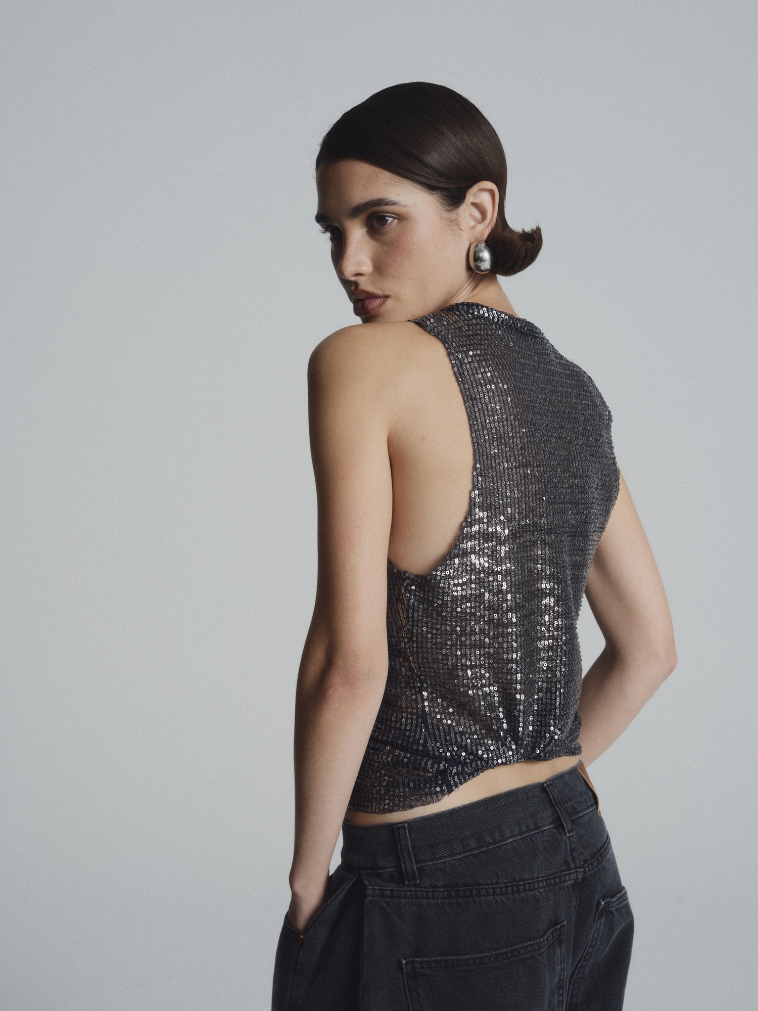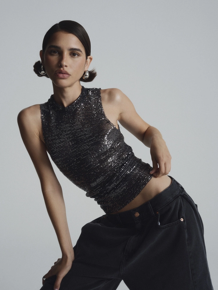 Cekinowy top, który łączy wieczorowy blask z casualową formą. Ma klasyczny, wysoko zabudowany pod szyją fason bezrękawnika, a drobne, gęsto rozmieszczone cekiny odbijają światło, wzmacniając wieczorowy charakter projektu i nadając mu wyważonej elegancji bez nadmiaru.