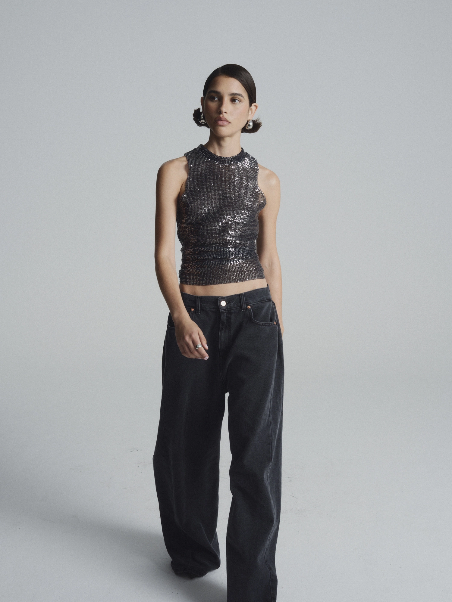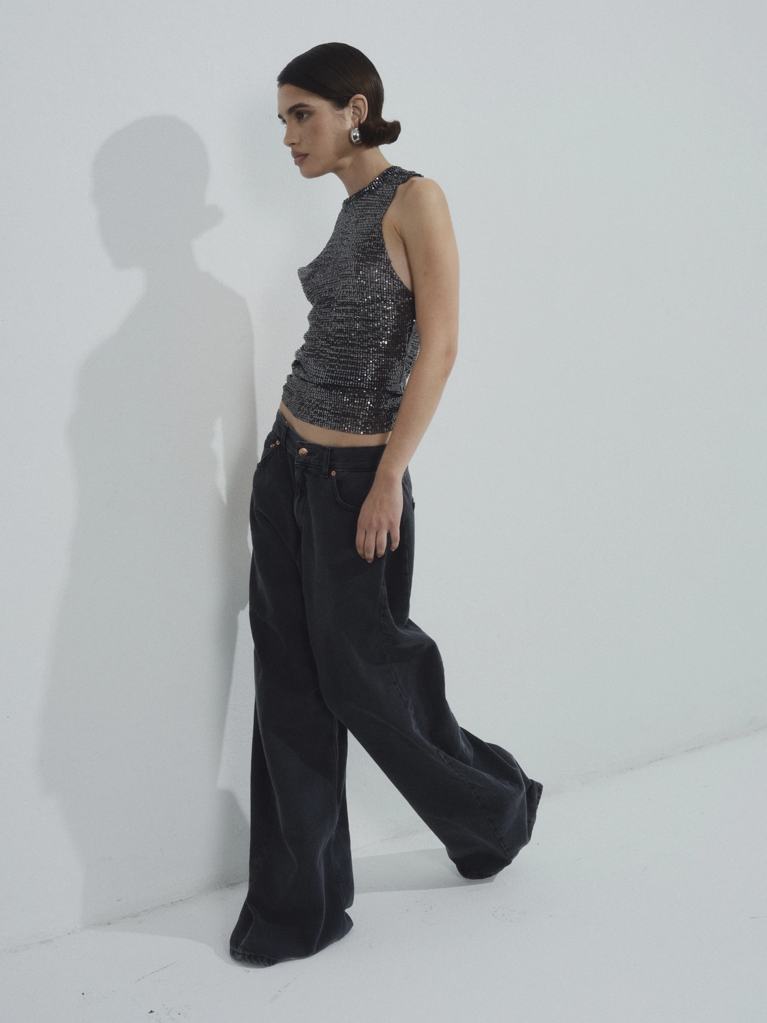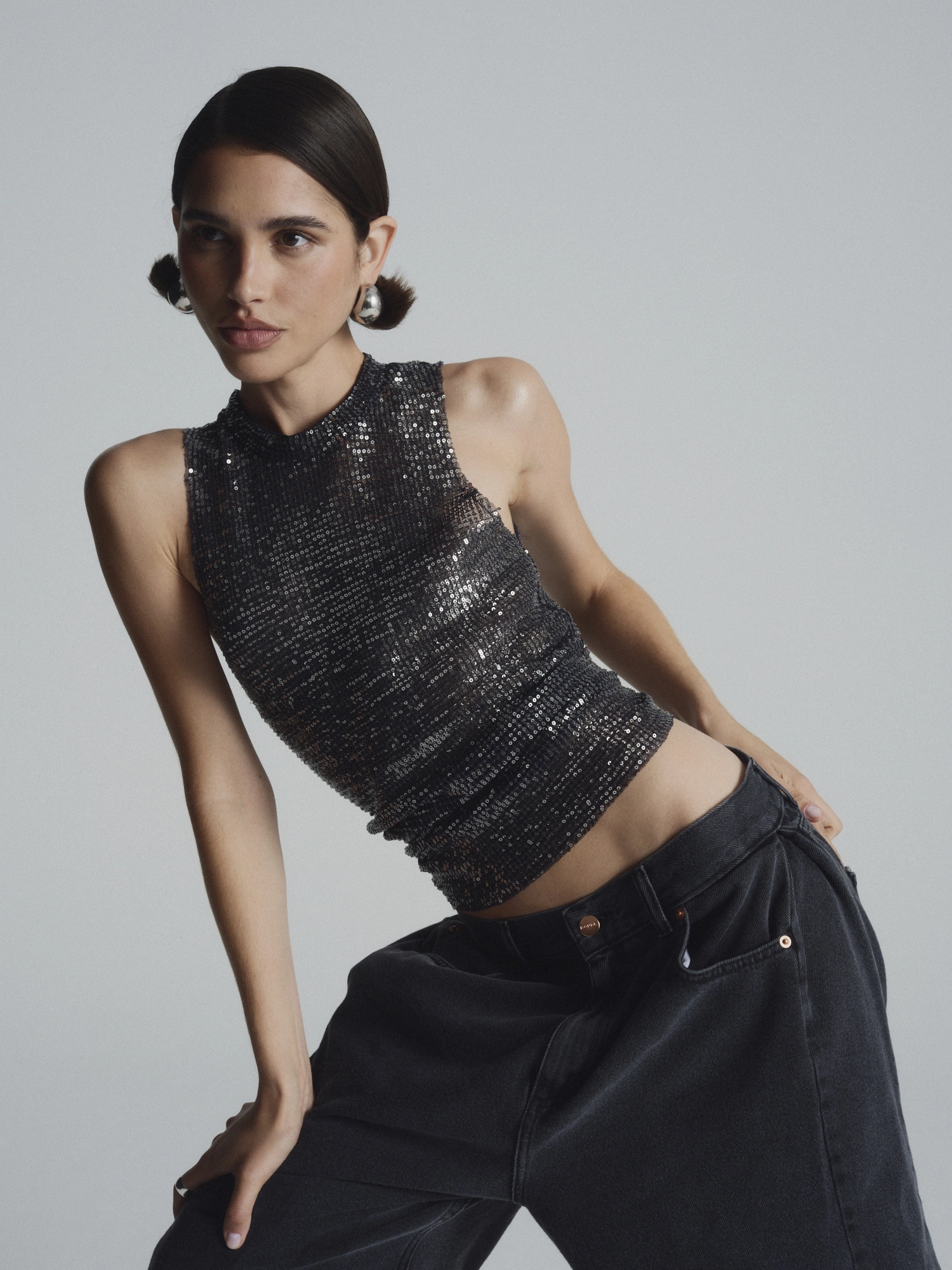 Cekinowy top, który łączy wieczorowy blask z casualową formą. Ma klasyczny, wysoko zabudowany pod szyją fason bezrękawnika, a drobne, gęsto rozmieszczone cekiny odbijają światło, wzmacniając wieczorowy charakter projektu i nadając mu wyważonej elegancji bez nadmiaru.