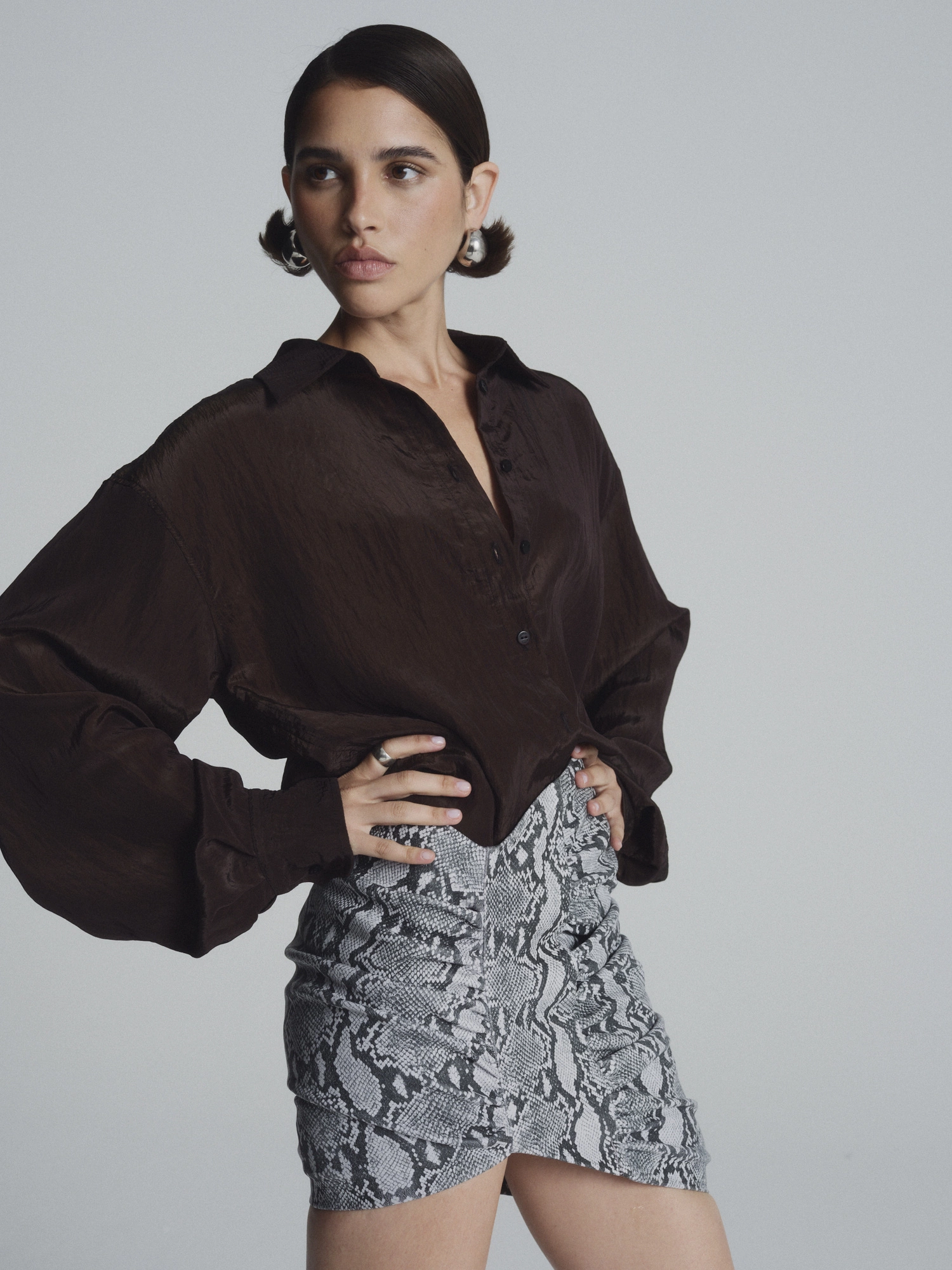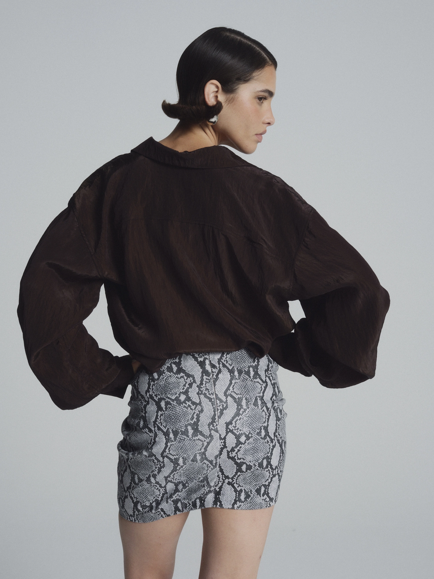 Skórzana spódnica mini wykonana z miękkiej skóry w charakterystyczny wężowy print. Ozdobne, nieregularne marszczenia na przodzie tworzą dynamiczną strukturę, która pięknie modeluje sylwetkę i nadaje projektowi nowoczesnej energii. Dopasowany fason naturalnie układa się na biodrach, tworząc efekt wysmuklonych proporcji.